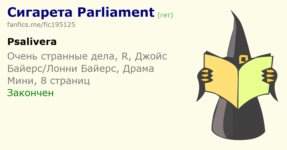 <a href="https://fanfics14.ru/fic195125"><b>Сигарета Parliament</b></a> (гет)<br>Автор: <a href="https://fanfics14.ru/user42173">Psalivera</a><br>Фандом: <a href="https://fanfics14.ru/fandom754">Очень странные дела</a><br>Персонажи: <a href="https://fanfics14.ru/paring40792_40805">Джойс Байерс/Лонни Байерс</a>, <a href="https://fanfics14.ru/paring37_40792">Джойс Байерс/Неизвестный Персонаж</a><br>Рейтинг: R<br>Жанр: Драма<br>Размер: Мини | 15 468 знаков<br>Статус: Закончен<br>События: Преканон<br>Предупреждения: Насилие<br>Саммари:<br>Может быть, в чем-то Байерс прав. Может быть, она правда заслуживает лучшего, но только ей нет дела до чьих-то слов, потому что Алан смотрит на нее сейчас так покорно и ласково.
