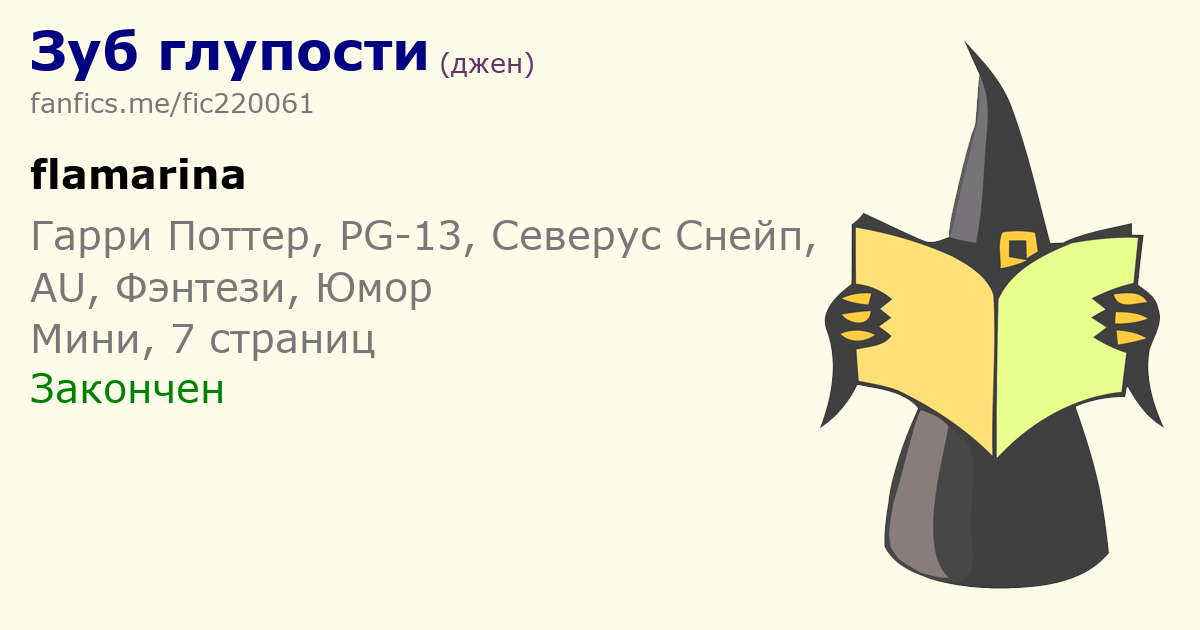 | #фидбэк_лиги_фанфикса Немного сумбурная, но симпатичная сказка. Начинается все с трагической гибели Снейпа, а дальше его кома чередуется с бытом Гермионы, и только в конце становится понятно, как эти две линии сюжет сходятся и переплетаются. Таким образом, с композицией все хорошо. Мне немножко не хватило «зубной» темы. Если с Гермионой все понятно и срабатывают отсылки про зубы, то хотелось бы и для Снейпа заранее какую-то зацепку про тот самый «зуб глупости», упомянутый только в конце текста. 1 | |